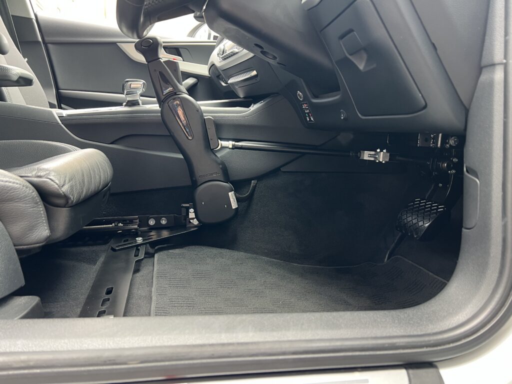 僕も操作してみましたが、コレ、結構いいかもしれないです。操作レバー軽いし、グリップ部分が滑りずらい素材で出来ているので、左手の人差し指中指、薬指の3本でクイクイってアクセル操作して、手のひらでキューっと押し込んで、ブレーキを掛ける感じ。レバー上部のみ動作するので、シートに干渉しずらいし、従来の手動運転装置よりも運転操作が楽になるかもしれないですね。手動運転装置をご利用のユーザー様にたくさんのご意見を頂戴したいので、是非、体験しに来て下さい。